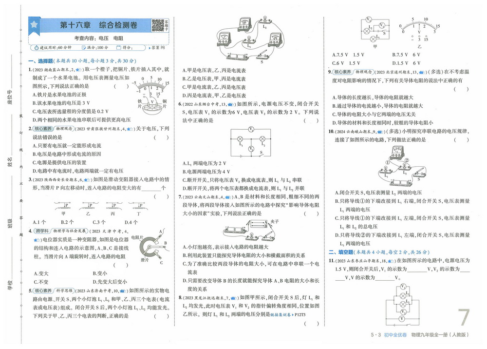 上一篇:人教版九年级上册物理第十六章测试卷八
