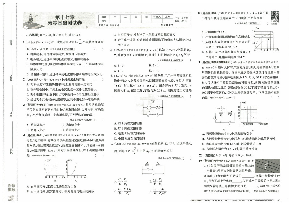 上一篇:人教版九年级上册物理第十七章测试卷一