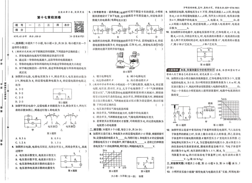 上一篇:人教版九年级上册物理第十七章测试卷五