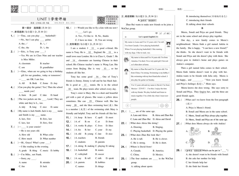 新教材人教版七年级上册英语Unit1测试卷一