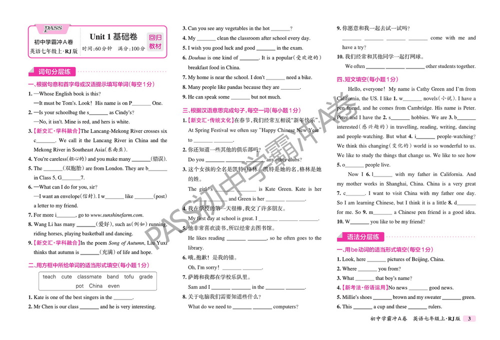 上一篇:新教材人教版七年级上册英语Unit1测试卷三