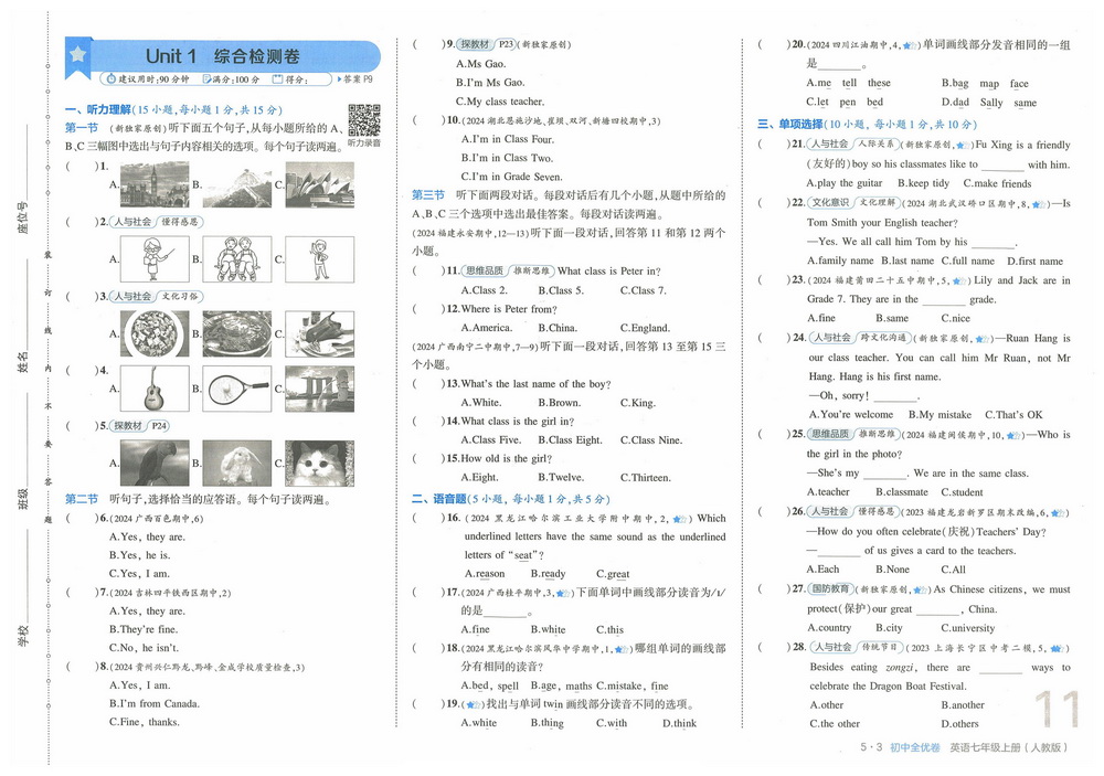 新教材人教版七年级上册英语Unit1测试卷八