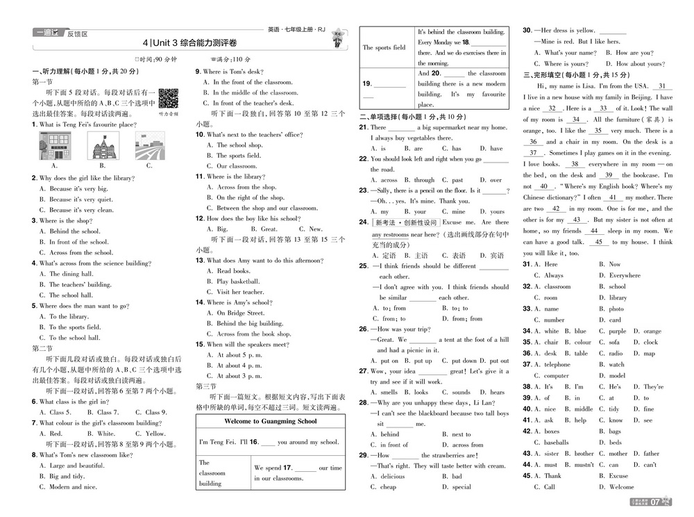 新教材人教版七年级上册英语Unit3测试卷四