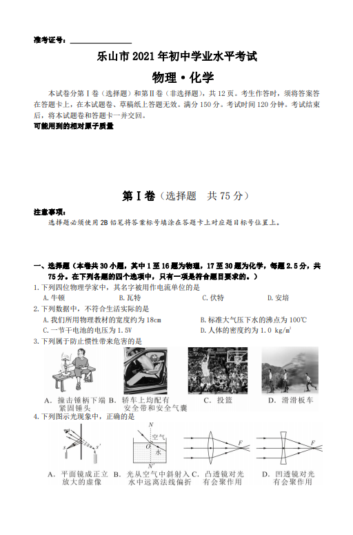 2022年江苏省淮安市初中学业水平考试物理试卷
