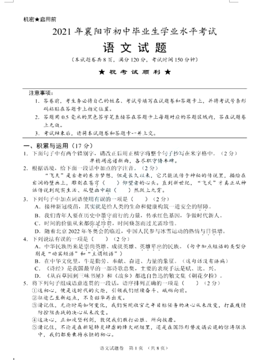 2021年湖北省襄阳市初中毕业学业水平考试语文试卷