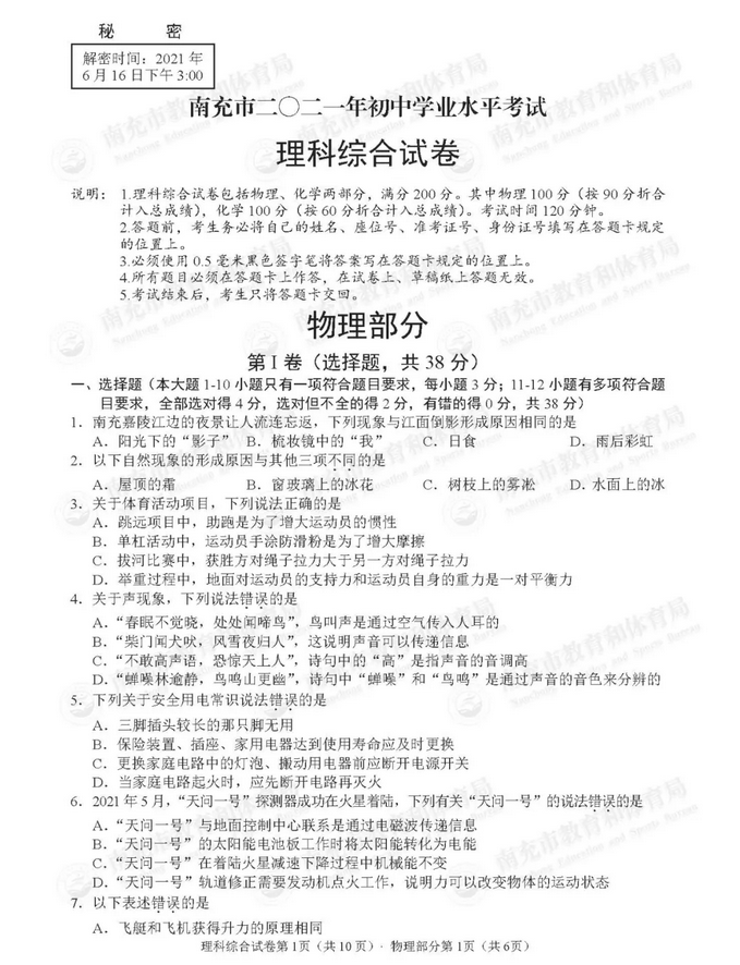 2021年四川南充初中毕业生学业考试理科综合试题