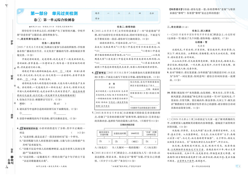 人教版九年级上册语文第一单元测试卷二
