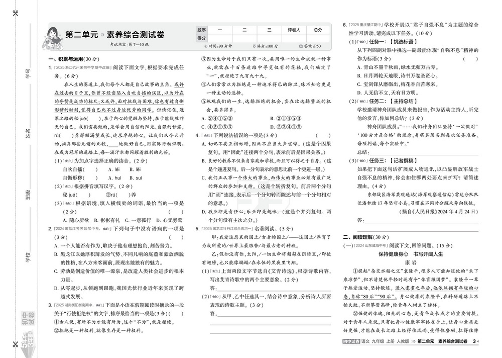 人教版九年级上册语文期末测试卷六