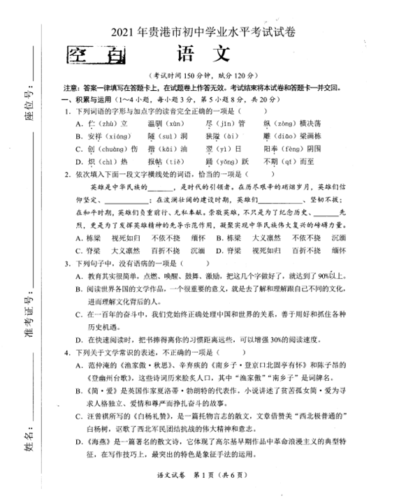 2021年广西省贵港市初中毕业学业水平考试语文试卷