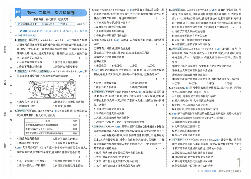 人教版九年级上册历史第一、二单元测试卷七