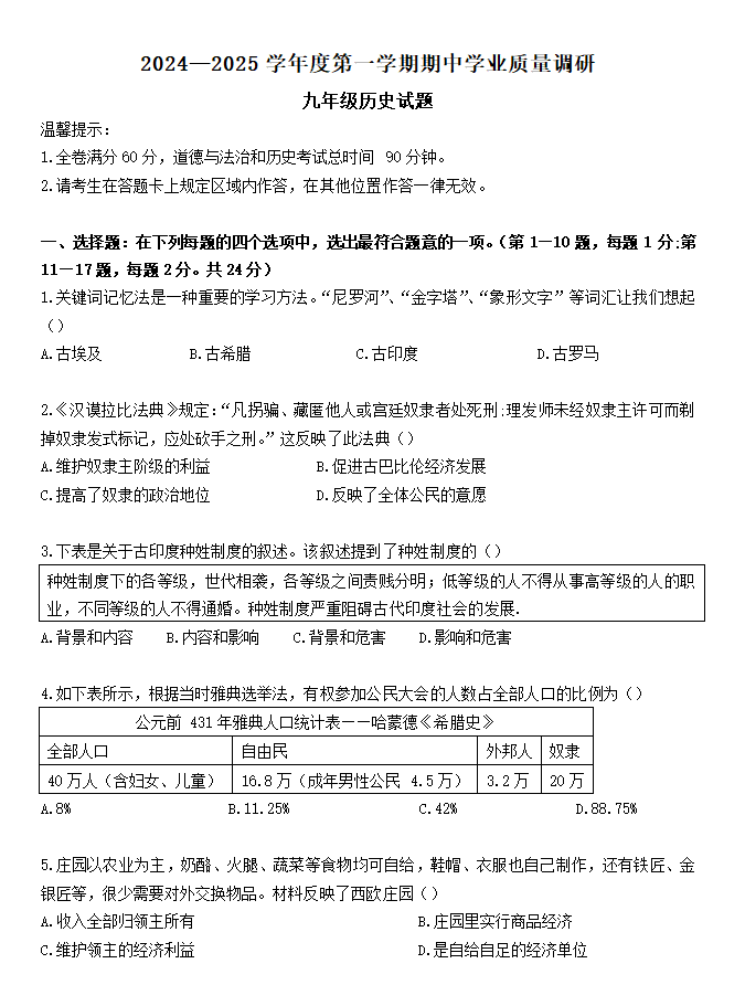 上一篇:河南省南阳市2024-2025学年九年级上学期11月期中历史试题