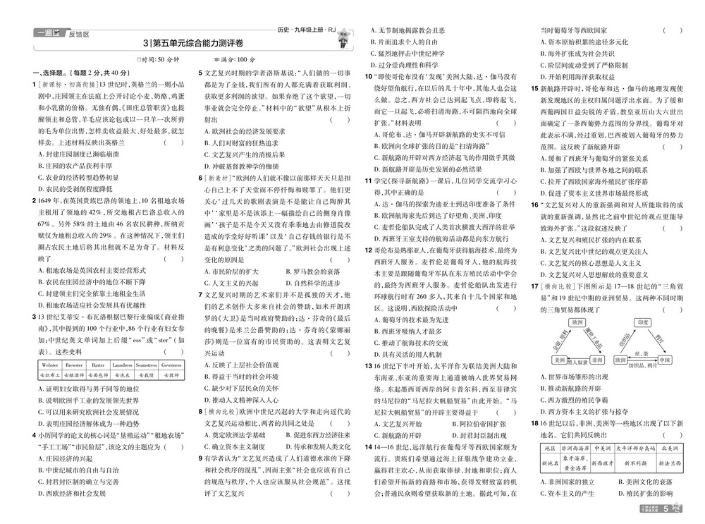 人教版九年级上册历史第五单元测试卷五