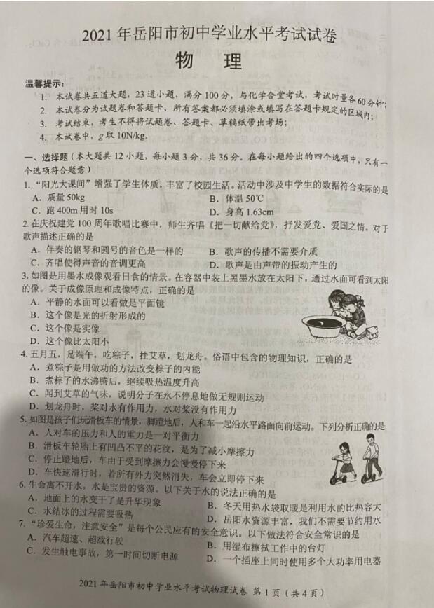 2021年湖南岳阳初中毕业生学业考试物理试题