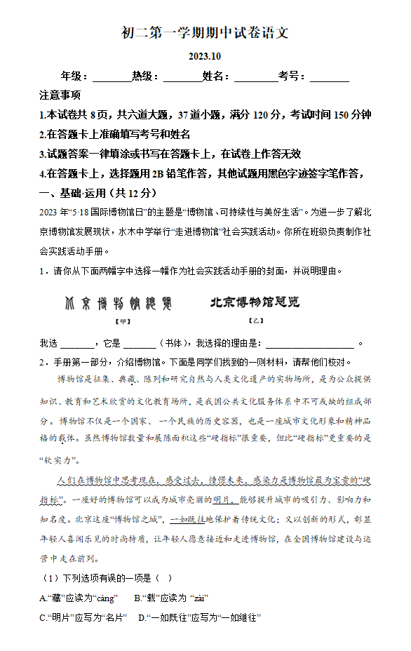 北京市海淀区清华附属中学2023-2024学年八年级上学期期中语文试题