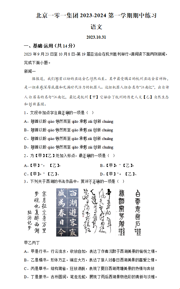 北京市一零一集团2023-2024学年八年级上学期期中语文试题