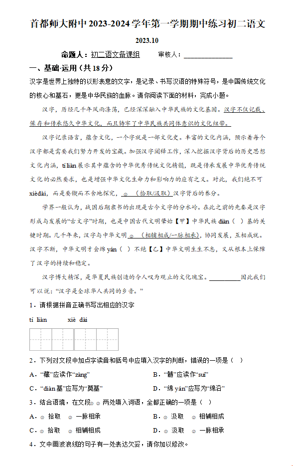 北京首都师范大学附属中学2023-2024学年八年级上学期期中语文试题