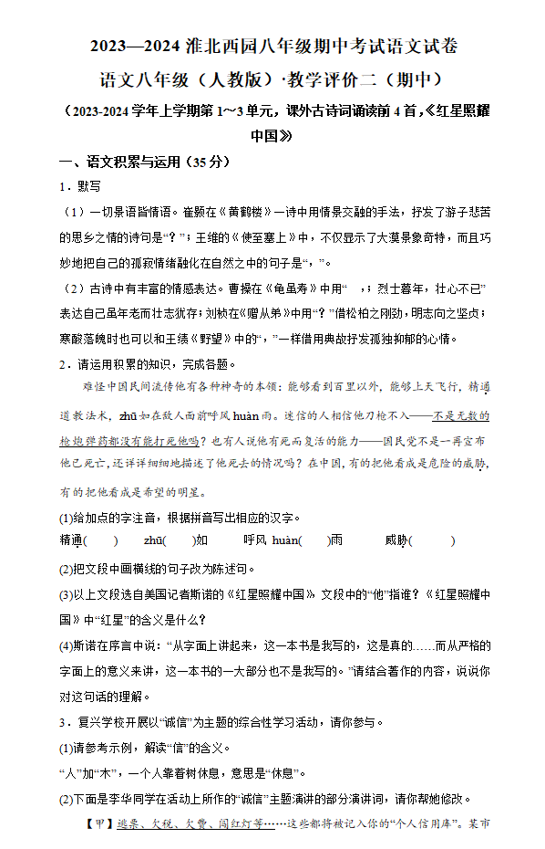 安徽省淮北市五校2023-2024学年八年级上学期期中语文试题