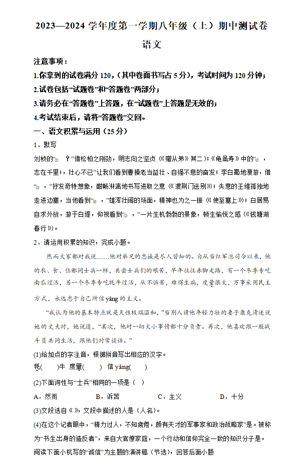 新教材人教版八年级上册语文期末测试卷二十四