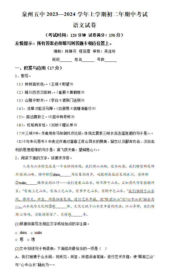 福建省泉州第五中学2023-2024学年八年级上学期期中语文试题
