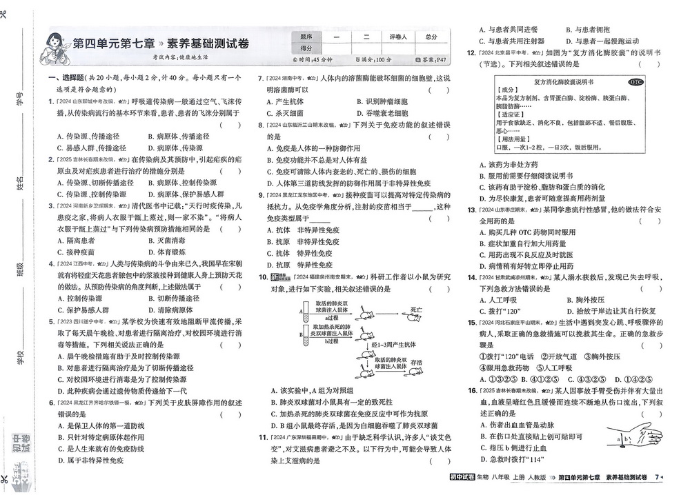 新教材人教版八年级上册生物第四单元第七章测试卷三