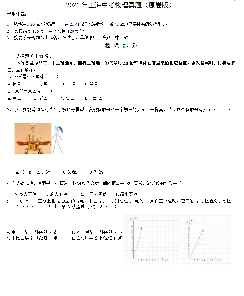 2021年上海市初中毕业生学业考试物理试题
