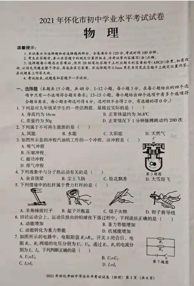 2021年湖南怀化市初中毕业生学业考试物理试题