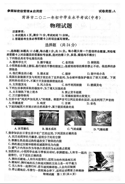 2021年山东菏泽市初中毕业生学业考试物理试题