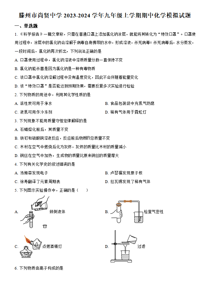 山东省枣庄市滕州市尚贤中学2023-2024学年九年级上学期期中模拟化学试题