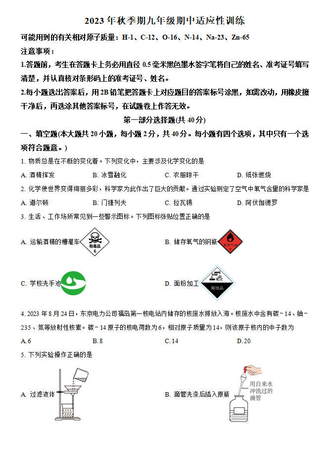重庆市育才中学2023-2024学年九年级上学期期中考试化学试题