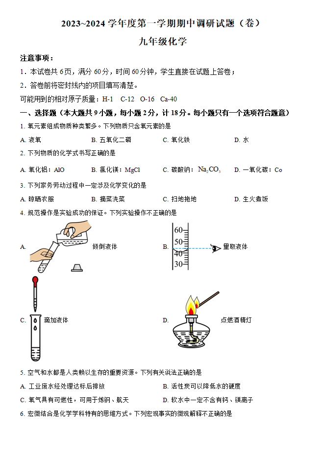 重庆市育才中学2023-2024学年九年级上学期期中考试化学试题