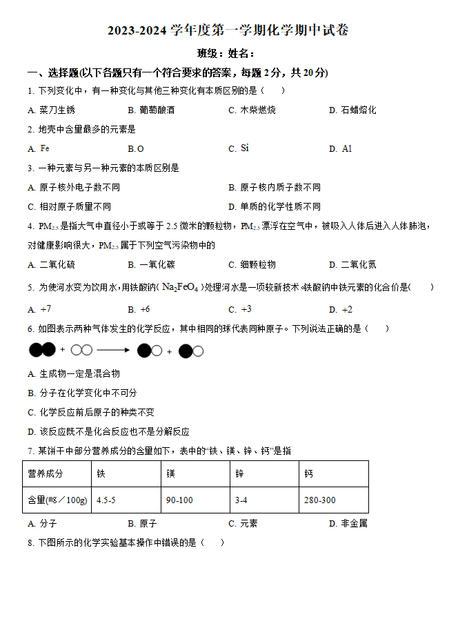 重庆市育才中学2023-2024学年九年级上学期期中考试化学试题