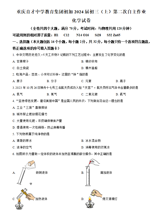 重庆市育才中学2023-2024学年九年级上学期期中考试化学试题