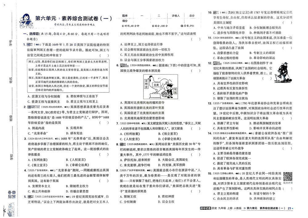 人教版九年级上册历史第七单元测试卷九