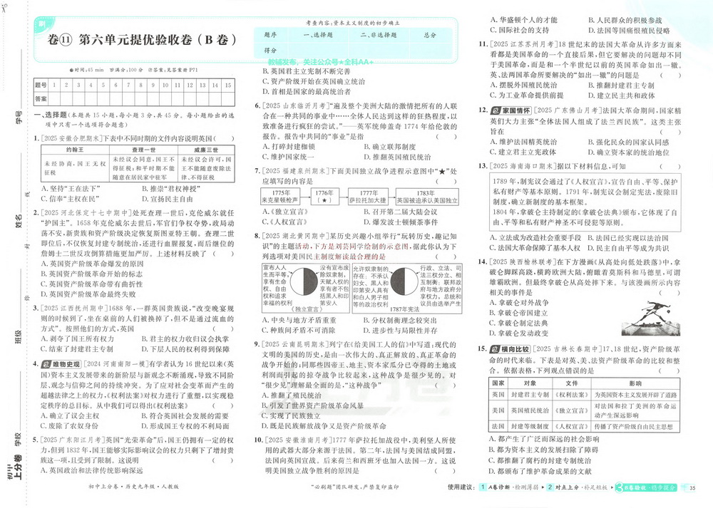 人教版九年级上册历史第七单元测试卷九
