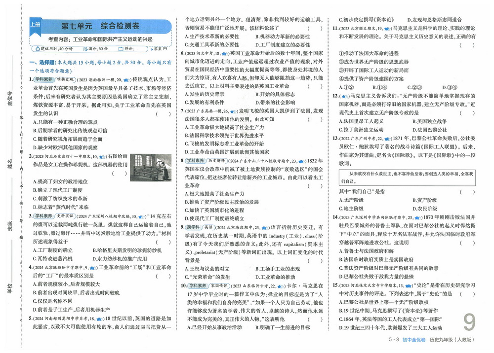 人教版九年级上册历史第七单元测试卷九