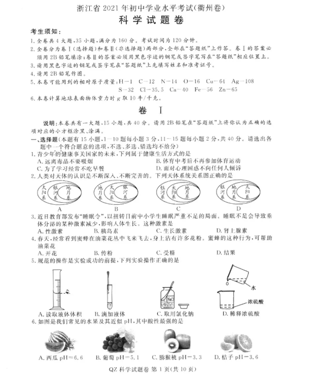 2021年浙江衢州市初中毕业生学业考试科学试题