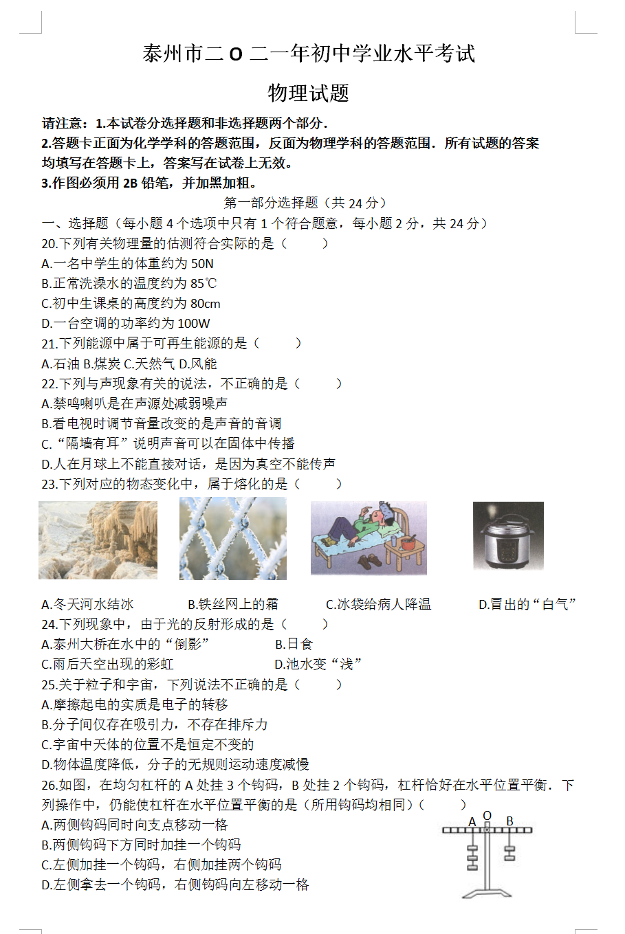 2021年江苏泰州市初中毕业生学业考试物理试题