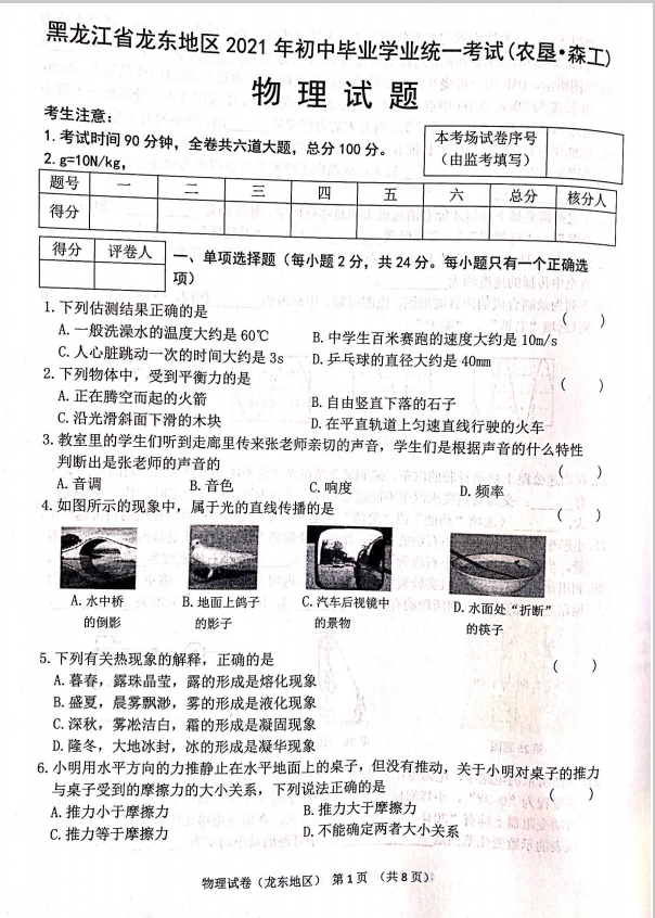 2021年黑龙江龙东地区初中毕业生学业考试物理试题