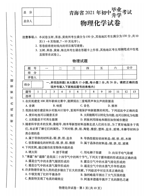 2021年青海省初中毕业生学业考试物理试题