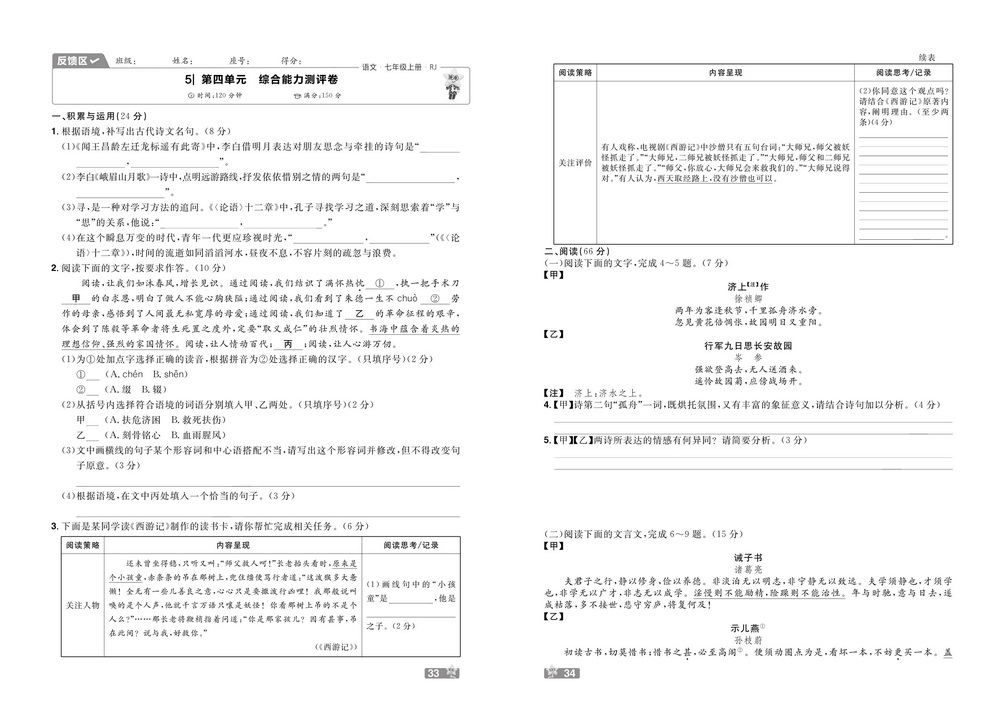 新教材人教版七年级上册语文第五单元测试卷四