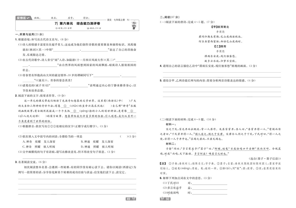 新教材人教版七年级上册语文第六单元测试卷四