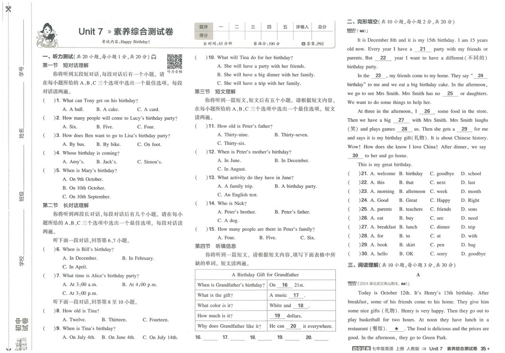 新教材人教版七年级上册英语Unit7测试卷四