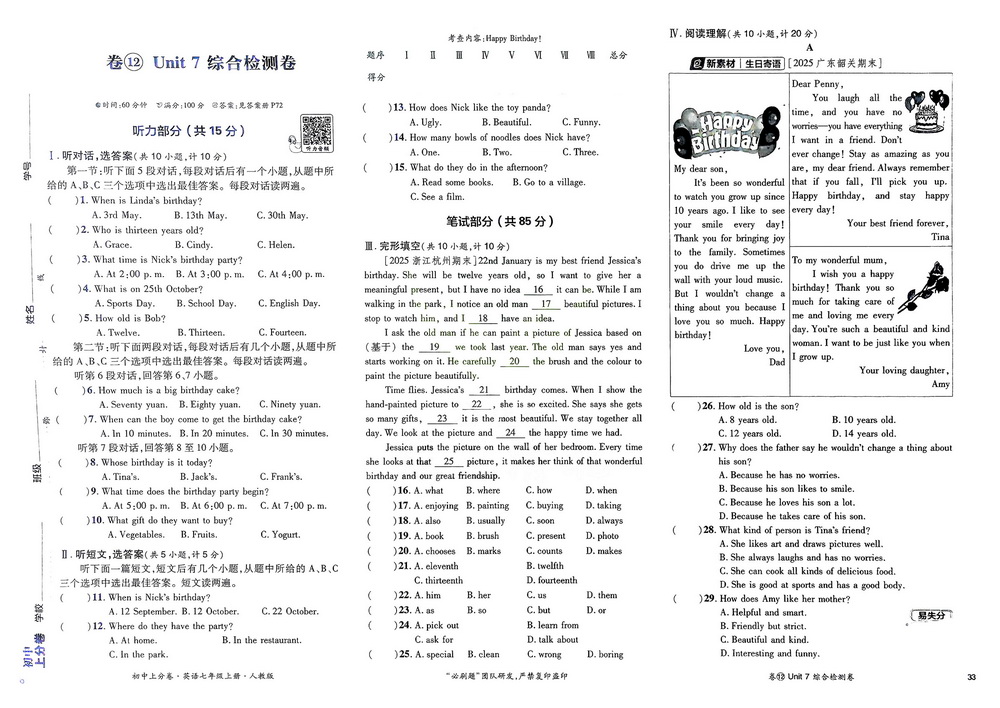 上一篇:新教材人教版七年级上册英语Unit7测试卷一