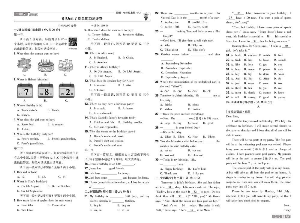 新教材人教版七年级上册英语Unit7测试卷三