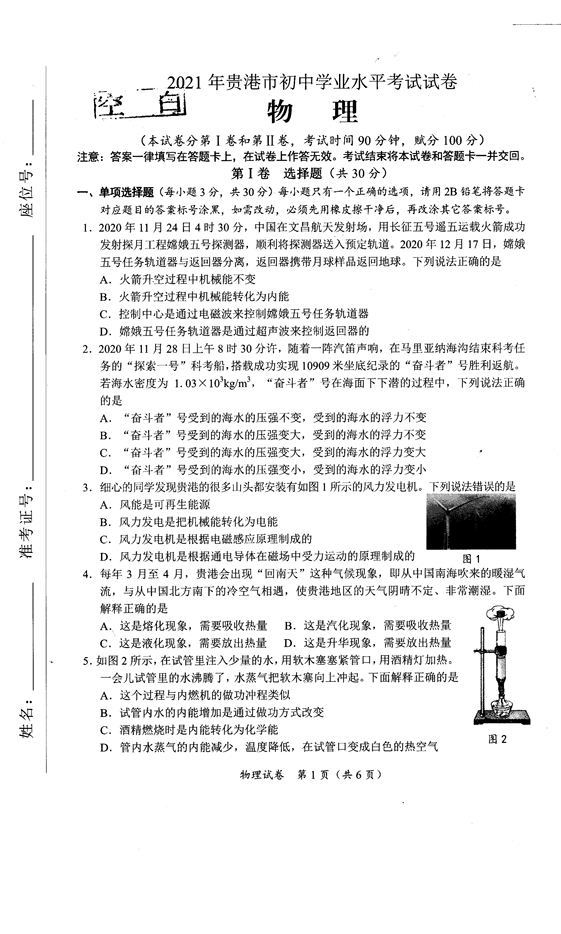 2022年贵州省铜仁市初中学业水平考试物理试卷