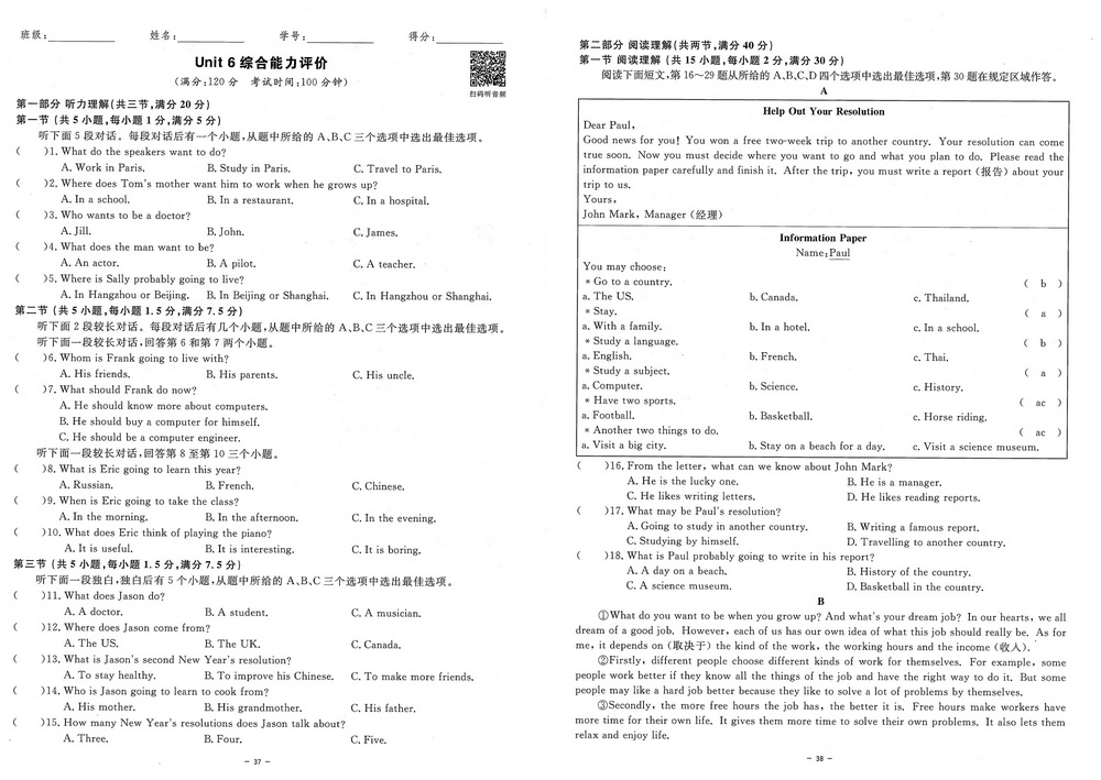 上一篇:新教材人教版八年级上册英语Unit6测试卷七