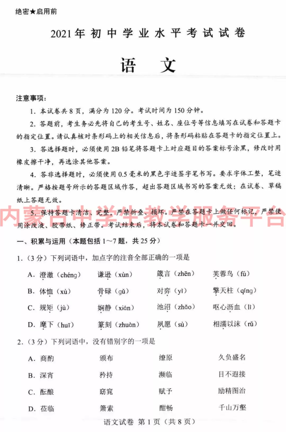 2021年内蒙古省包头市初中毕业学业水平考试语文试卷