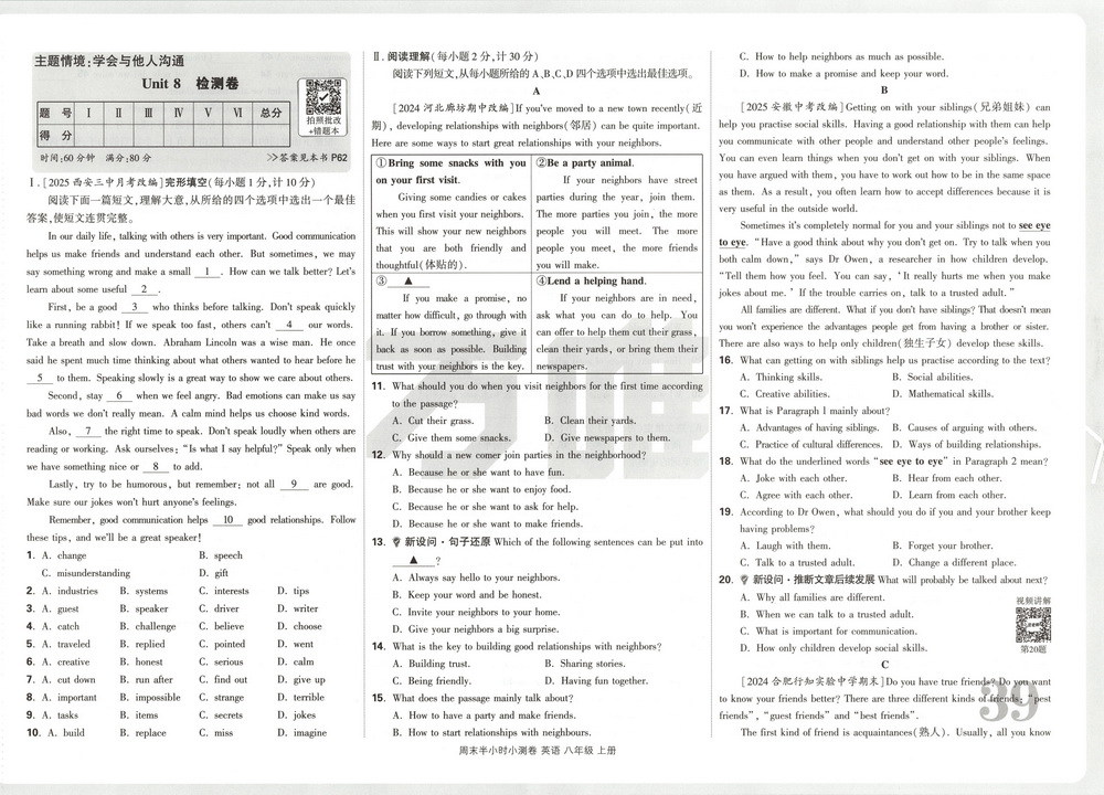 新教材人教版八年级上册英语Unit8测试卷四