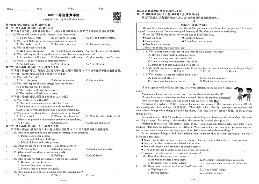上一篇:新教材人教版八年级上册英语Unit8测试卷六