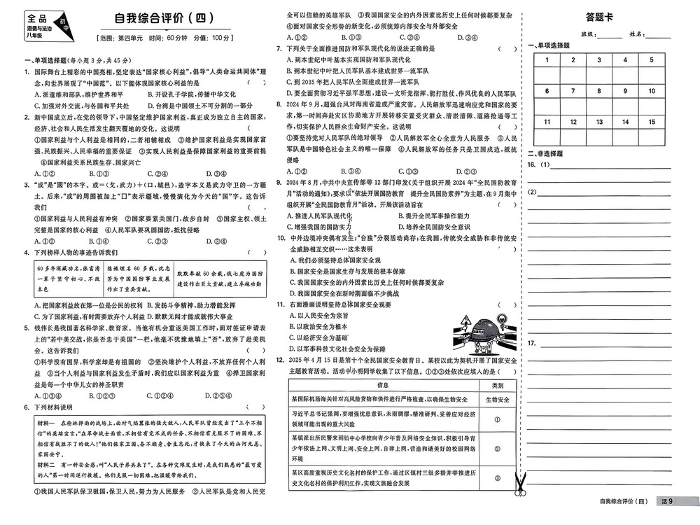 新教材人教版八年级上册道德与法治第四单元测试卷八